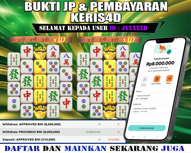 Setiap hari, member KERIS4D berhasil meraih jackpot besar dari berbagai provider slot ternama yang kami sediakan, seperti Pragmatic Play, Habanero, PG Soft, dan masih banyak lagi. Kami secara rutin menampilkan bukti screenshot atau rekapan kemenangan yang berhasil diraih, mulai dari kemenangan ratusan ribu hingga puluhan juta rupiah. Semua slip kemenangan ini kami hadirkan untuk membuktikan bahwa di KERIS4D, peluang menang itu nyata.
