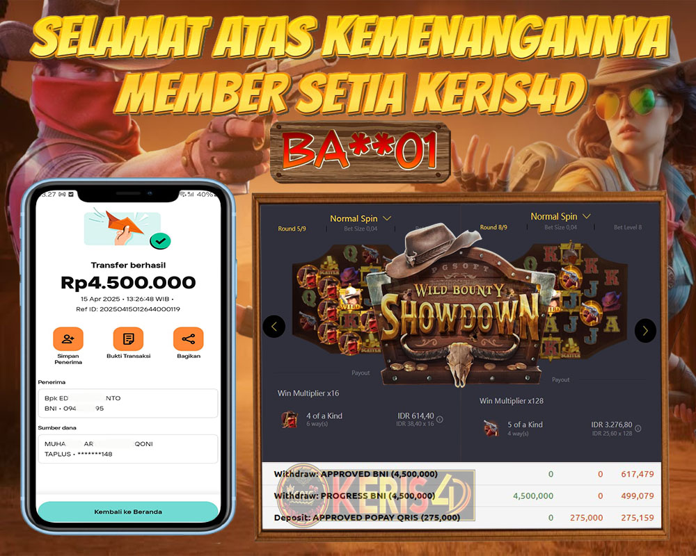 KERIS4D dikenal sebagai situs terpercaya yang selalu menghadirkan pengalaman bermain slot online yang aman, fair, dan berlisensi resmi. Di sini, kami tidak hanya sekadar memberikan janji, tapi bukti nyata berupa slip kemenangan yang dapat Anda lihat secara langsung.