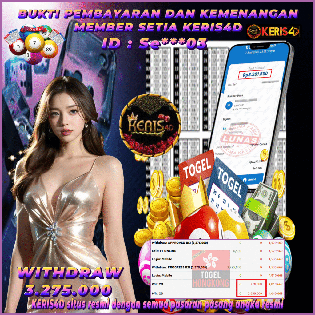 KERIS4D dikenal sebagai situs terpercaya yang selalu menghadirkan pengalaman bermain slot online yang aman, fair, dan berlisensi resmi. Di sini, kami tidak hanya sekadar memberikan janji, tapi bukti nyata berupa slip kemenangan yang dapat Anda lihat secara langsung.